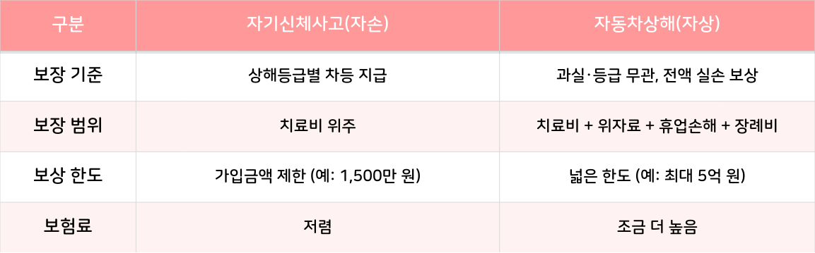 | 구분 | 자기신체사고(자손) | 자동차상해(자상) |